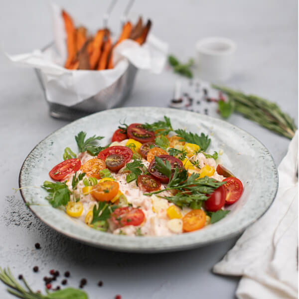 Bunter Herbstsalat mit Süßkartoffeln und WOJNAR’S Shrimp-Salat