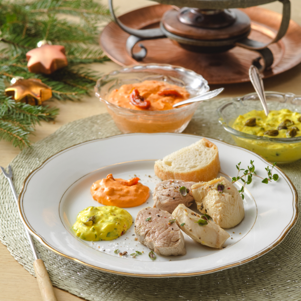 Fleischfondue mit WOJNAR’S Tramezzini Ei-Curry und WOJNAR’S Liptauer Scharf